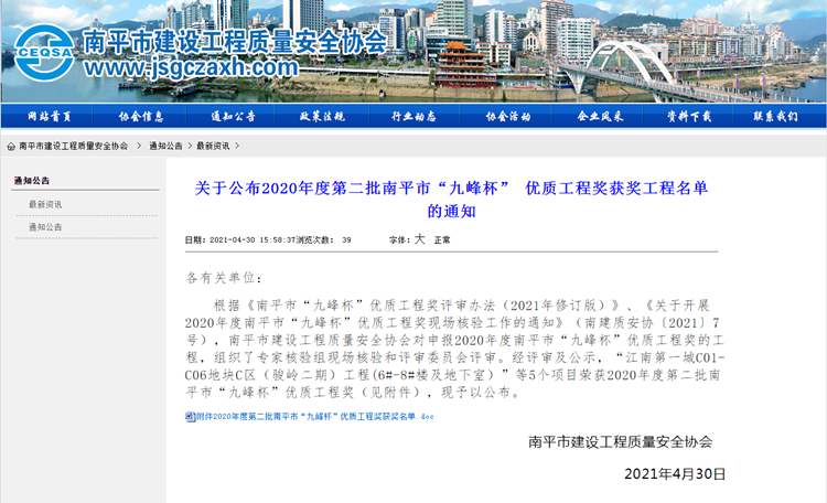 4月30日,南平市建設(shè)工程質(zhì)量安全協(xié)會(huì)公布了2020年度第二批南平市“九峰杯”優(yōu)質(zhì)工程獎(jiǎng),由安徽三建公司承建的南平駿嶺二期項(xiàng)目、駿嶺三期項(xiàng)目榜上有名,喜獲“九峰杯”優(yōu)質(zhì)工程獎(jiǎng),該獎(jiǎng)項(xiàng)是南平市建設(shè)工程最高獎(jiǎng)項(xiàng)。