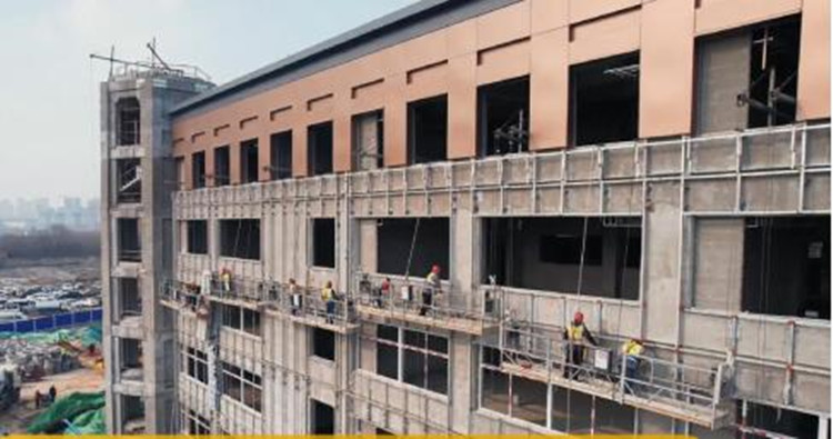 幕墻安裝——是該項(xiàng)目的又一大難題,而解決它的前置條件就是吊籃的架設(shè)!經(jīng)測算,該工程的吊籃使用量不低于500臺(tái)。為此,項(xiàng)目部提前組織觀摩多個(gè)吊籃公司,制定方案。吊籃安裝時(shí)正值室外開挖埋管時(shí)期,項(xiàng)目部夜間加班,通過先組裝后吊裝的方式,有效地解決了工作面交叉作業(yè)的問題。從2022年1月6日12#、14#宿舍樓的第一批吊籃安裝開始,500多臺(tái)吊籃從告知到驗(yàn)收再到使用登記,項(xiàng)目部加班加點(diǎn)僅用20天就完成了工作,使吊籃的整體使用時(shí)間比預(yù)期縮短了15天??苿?chuàng)中心樓位于項(xiàng)目西南角、南大門西側(cè),正處于形象展示樣板區(qū)域,春節(jié)前必須安裝到位。當(dāng)時(shí)已近年關(guān),大量的勞務(wù)人員已踏上返鄉(xiāng)的路程。為了不影響項(xiàng)目進(jìn)度,項(xiàng)目部與吊籃租賃公司多次溝通協(xié)調(diào),動(dòng)之以情,曉之以理,最終在年前把第一批吊籃架設(shè)成功,并順利通過驗(yàn)收,為節(jié)點(diǎn)性樣板間的按期完工奠定了基礎(chǔ)。把一切能提前、能加班完成的工作提前完成、加班完成——這是項(xiàng)目所有人的統(tǒng)一思想。