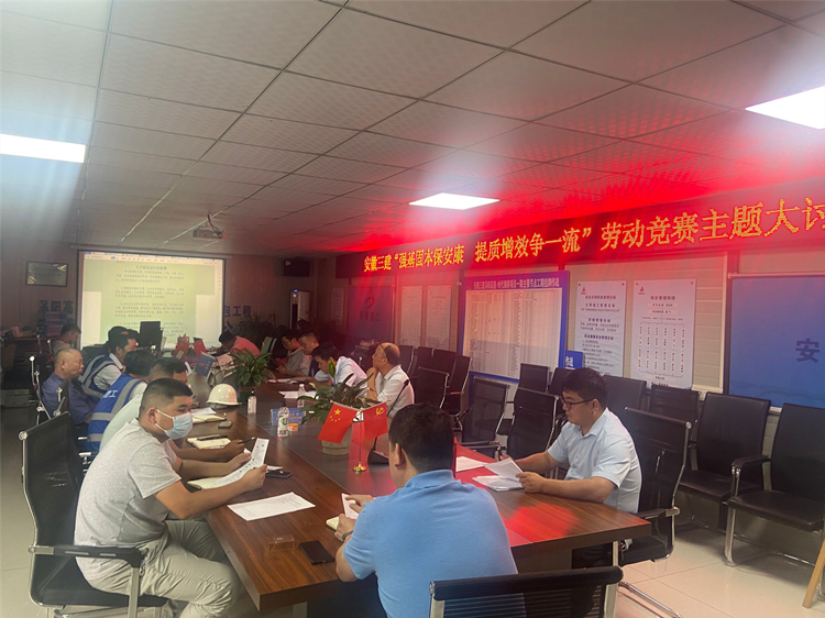 7月6日上午,項(xiàng)目部立即組織召開勞動競賽動員大會和主題大討論,成立競賽領(lǐng)導(dǎo)小組。根據(jù)全年生產(chǎn)經(jīng)營任務(wù)指標(biāo)對各項(xiàng)工作進(jìn)行分解,制定科學(xué)合理競賽方案,明確時間、節(jié)點(diǎn)及要求,層層落實(shí),責(zé)任到人。全體職工秉承“開工即決戰(zhàn),起步即沖刺”的理念,對管理人員進(jìn)行勞動競賽方案交底,與班組簽訂勞動競賽施工進(jìn)度責(zé)任狀,根據(jù)節(jié)點(diǎn)下發(fā)班組施工任務(wù)書,要求簽字確認(rèn),以保證現(xiàn)場工期進(jìn)度的及時性。項(xiàng)目部通過電子屏、宣傳欄、橫幅標(biāo)語、張貼作戰(zhàn)圖以及新聞宣傳等多種方式,加強(qiáng)競賽宣傳,營造大干快上競賽氛圍,同時做到“四個到位”,物資設(shè)備精準(zhǔn)到位、安全管控落實(shí)到位、技術(shù)質(zhì)量把控到位、后勤服務(wù)保障到位。