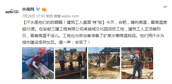 安徽日?qǐng)?bào)、央視網(wǎng)微博——汗水是他們的防曬霜 建筑工人直面“烤”驗(yàn) 發(fā)布時(shí)間:2017-10-22 來(lái)源:安徽日?qǐng)?bào)、央視網(wǎng)微博 撰稿人:安徽三建 瀏覽次數(shù):13188