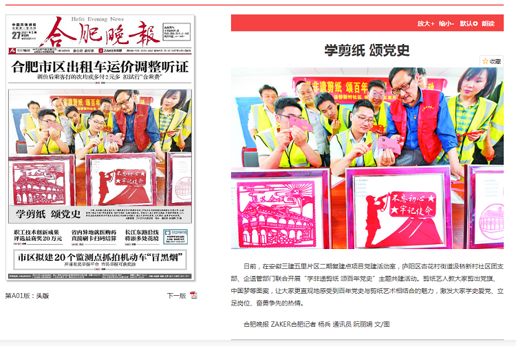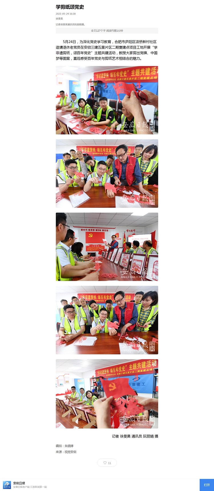 安徽日?qǐng)?bào)、合肥晚報(bào)、安徽日?qǐng)?bào)公眾號(hào)——學(xué)剪紙頌黨史 發(fā)布時(shí)間:2021-06-07 來源: 撰稿人: 瀏覽次數(shù):12275
