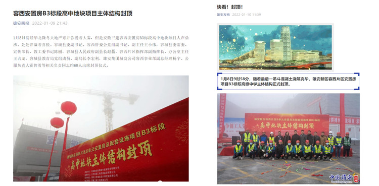 此外,人民雄安網(wǎng)《雄安容西片區(qū)高中封頂、未來(lái)可容納1920名學(xué)生》、新浪網(wǎng)《雄安新區(qū)容西片區(qū)B3標(biāo)段高級(jí)中學(xué)主體結(jié)構(gòu)封頂》、中國(guó)雄安官網(wǎng)《看建雄安丨容西片區(qū)B3標(biāo)段高級(jí)中學(xué)主體結(jié)構(gòu)封頂》以及河北日?qǐng)?bào)報(bào)業(yè)集團(tuán)、雄安發(fā)布、澎湃新聞等多家媒體官網(wǎng)、公眾號(hào)、微博客戶端對(duì)此次封頂儀式進(jìn)行了宣傳報(bào)道,贏得點(diǎn)贊紛紛。