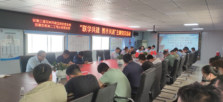 為扎實(shí)推進(jìn)學(xué)習(xí)貫徹習(xí)近平新時(shí)代中國(guó)特色社會(huì)主義思想主題教育,進(jìn)一步提升黨建與項(xiàng)目生產(chǎn)經(jīng)營(yíng)工作深度融合,5月23日下午,安徽三建潭沖河家園項(xiàng)目黨支部聯(lián)合安徽交航第二工程公司黨支部在共同施工的潭沖河家園項(xiàng)目開(kāi)展“聯(lián)學(xué)共建 攜手共進(jìn)”主題黨日活動(dòng)。安徽三建四公司、交航二公司黨政負(fù)責(zé)人及項(xiàng)目黨員、部分項(xiàng)目骨干30余人參加活動(dòng)。