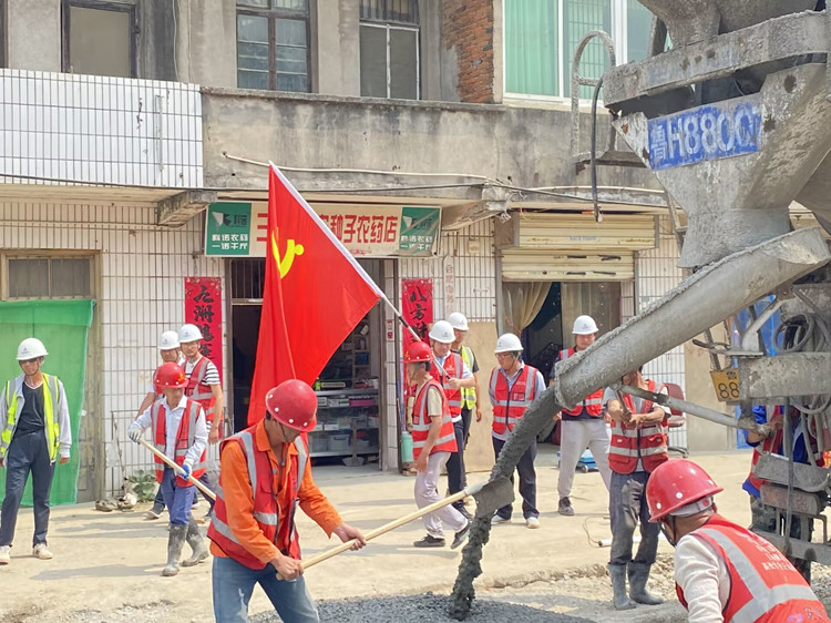 三十崗鄉(xiāng)三豐路集鎮(zhèn)段全長240m,原為4米寬村村通水泥路,因年久失修,路面有局部坑洼,給當(dāng)?shù)氐拇迕裆畛鲂袔硪欢ǖ牟槐悖藯l道路也是項(xiàng)目土方外運(yùn)的必經(jīng)之路。為感謝當(dāng)?shù)卮迕駥?duì)項(xiàng)目建設(shè)的支持,今年6月,八公司清瀾苑項(xiàng)目臨時(shí)黨支部主動(dòng)承擔(dān)起該條道路的修復(fù)義務(wù),并根據(jù)現(xiàn)場實(shí)際情況制定了針對(duì)性強(qiáng)、可實(shí)施性高的道路修復(fù)施工方案。在修復(fù)過程中,項(xiàng)目黨員干部和多名經(jīng)驗(yàn)豐富的一線職工頂住炎熱、突擊搶修,為道路品質(zhì)提供了有力保障。村民們?yōu)楦兄x搶修組,紛紛拿來礦泉水、西瓜等。