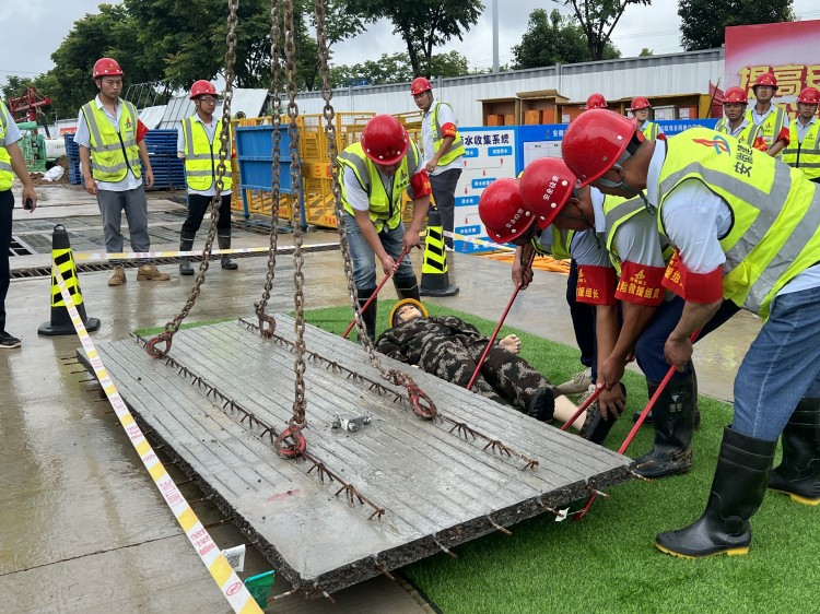 演練真實(shí)地模擬了人員遭遇安全事故的應(yīng)急處置及救援過(guò)程。模擬人員在進(jìn)行疊合板拼裝過(guò)程中,由于吊索斷裂,吊物在倒下過(guò)程中,不幸將地面一名工人腳掌砸傷,受傷工人的右腳掌被吊物壓住,發(fā)生起重傷害安全事故,項(xiàng)目及時(shí)組織開展科學(xué)、有效的救援。
