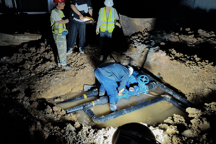 一天晚上,正值項(xiàng)目室外給水及消防新老管網(wǎng)接駁,為了確保工程萬(wàn)無(wú)一失,建工三建優(yōu)秀共產(chǎn)黨員、安裝項(xiàng)目經(jīng)理曾小均同志充分發(fā)揮黨員先鋒模范帶頭作用,與施工員高峰同志一起下到泥濘不堪的水坑中安裝閥門(mén)。由于夜間作業(yè)面的能見(jiàn)度受到限制,于是,技術(shù)員孫維康同志便舉著燈,同技術(shù)負(fù)責(zé)楊濤同志一起摸排接駁的管道是否存在漏水點(diǎn)。雖然工作很辛苦,但是看到大家都在為了達(dá)成同一個(gè)目標(biāo)而共同拼搏的場(chǎng)景,每一個(gè)安裝管理人員又都充滿(mǎn)干勁,就像曾小均說(shuō)的那樣:“這是安裝人應(yīng)有的使命與擔(dān)當(dāng)!是建工三建一脈相承的鐵軍精神和不辱使命鐵肩擔(dān)當(dāng)。”