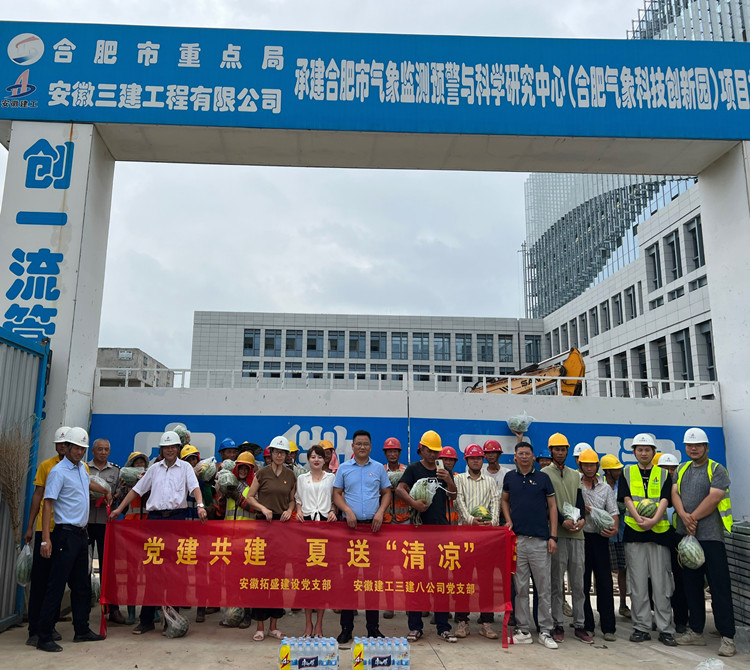 6月30日,八公司黨支部聯合安徽拓盛建設黨支部深入合肥市氣象監(jiān)測預警與科學研究中心項目,看望慰問一線職工,開展“送清涼”活動。