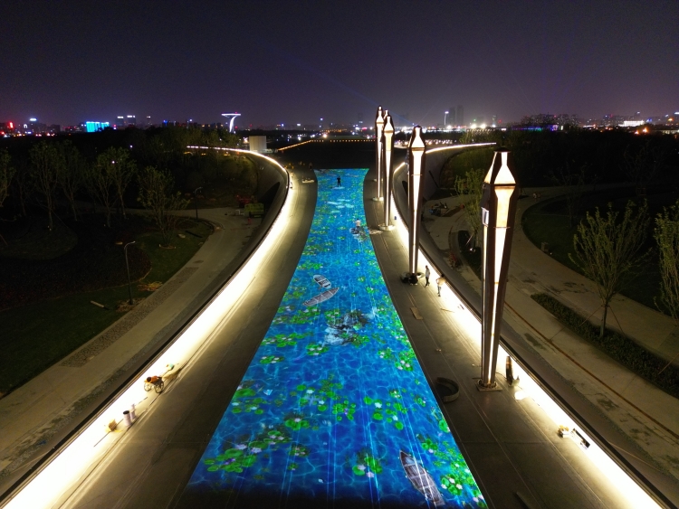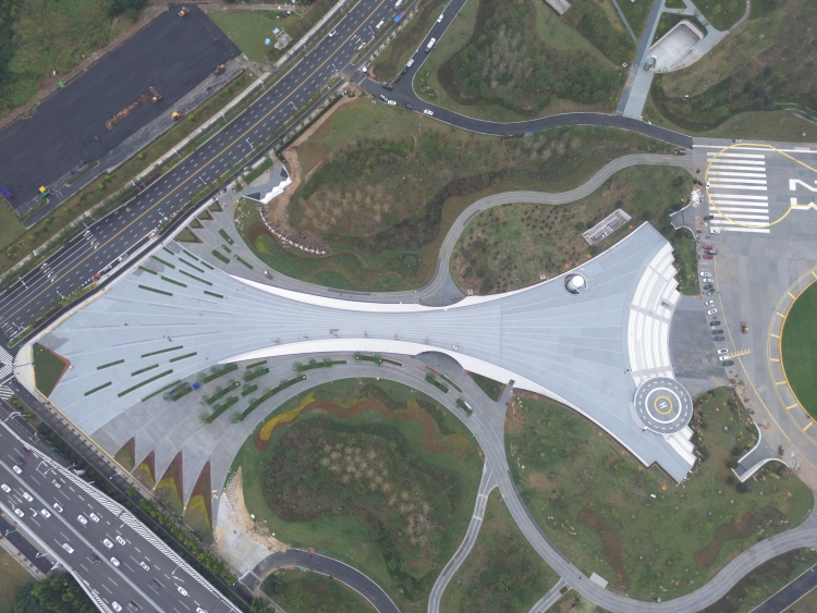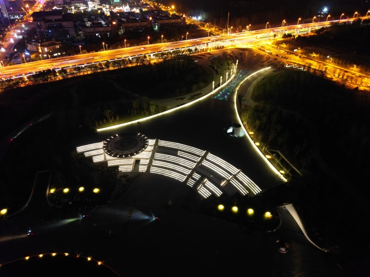 如今,站在合肥園博園南入口寬闊的廣場(chǎng)上,可以看到數(shù)根細(xì)長的線條從腳下一直向坡道盡頭延伸,象征著飛機(jī)爬升過程中的氣流形態(tài)。沿著150米長的緩坡道步行而上,可見右側(cè)聳立著七根高度為11.5米的有著“七星攬?jiān)隆泵雷u(yù)的景觀燈,夜間不僅能為游客帶來暖色的柔和燈光,最頂端碩大的全色激光投影儀還能在坡道面上投下美輪美奐的動(dòng)態(tài)畫面,將入口裝點(diǎn)得更加夢(mèng)幻。登頂8米高的觀景平臺(tái),右側(cè)是圓形的直升機(jī)停機(jī)坪,向遠(yuǎn)方眺望,3公里長的機(jī)場(chǎng)大草坪和整個(gè)園博園的景色盡收眼底,引人不由駐足觀賞。