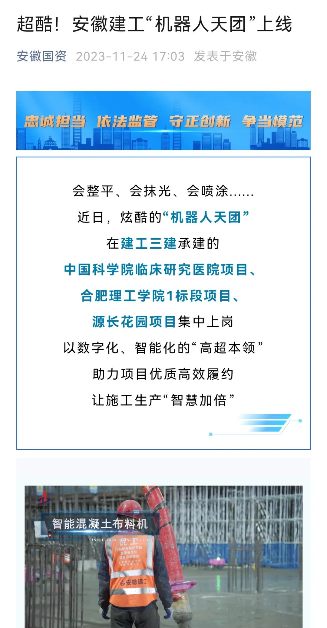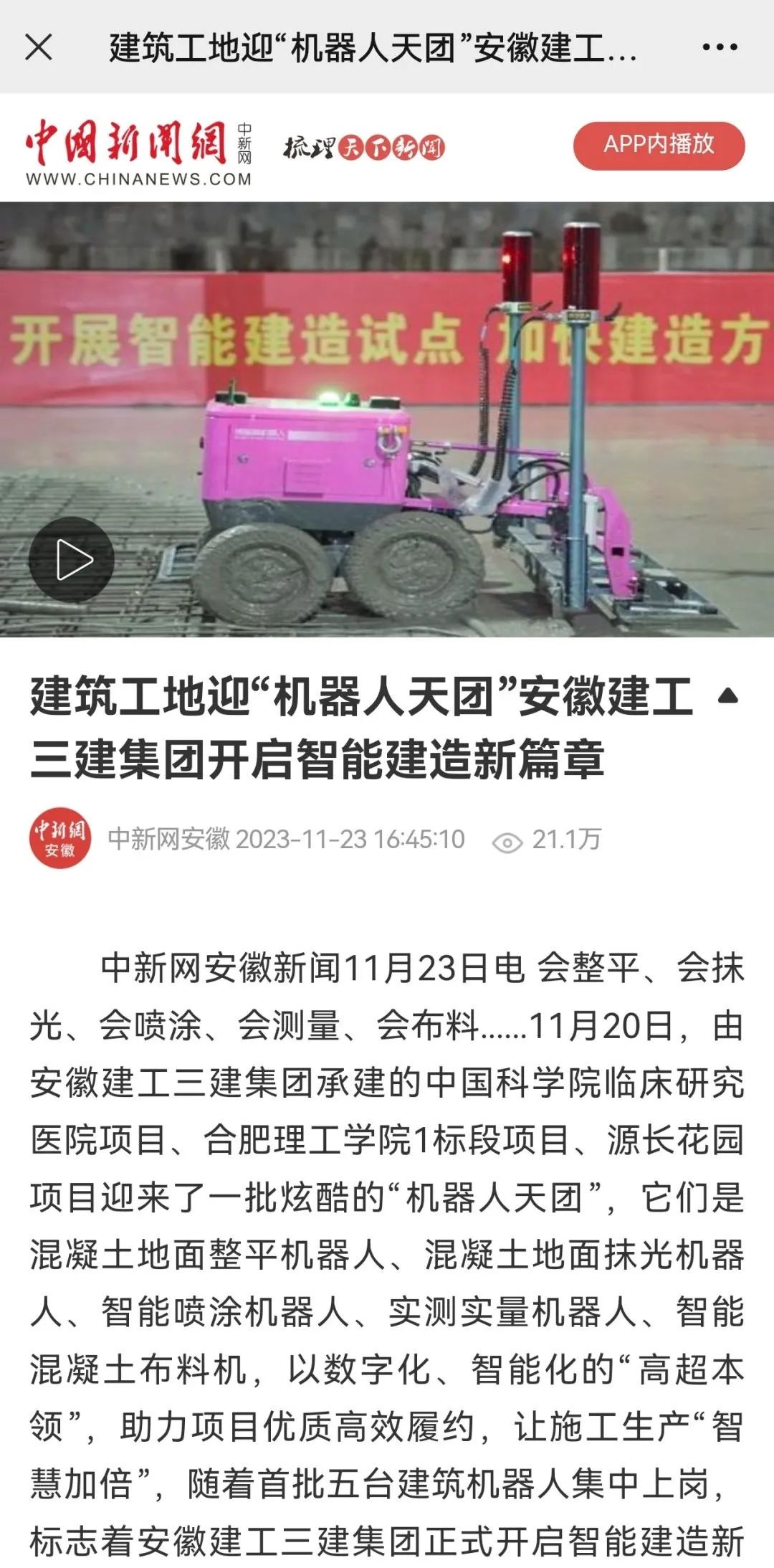 11月23日,中新網(wǎng)、安徽國(guó)資、合肥晚報(bào)以“建筑工地迎‘機(jī)器人天團(tuán)’安徽建工三建集團(tuán)開(kāi)啟智能建造新篇章”為題,專題報(bào)道公司首批引進(jìn)五臺(tái)建筑機(jī)器人助力項(xiàng)目高質(zhì)量建設(shè),開(kāi)啟智能建造新篇章,受到廣泛關(guān)注。截至發(fā)稿時(shí),閱讀量已超20萬(wàn)次。