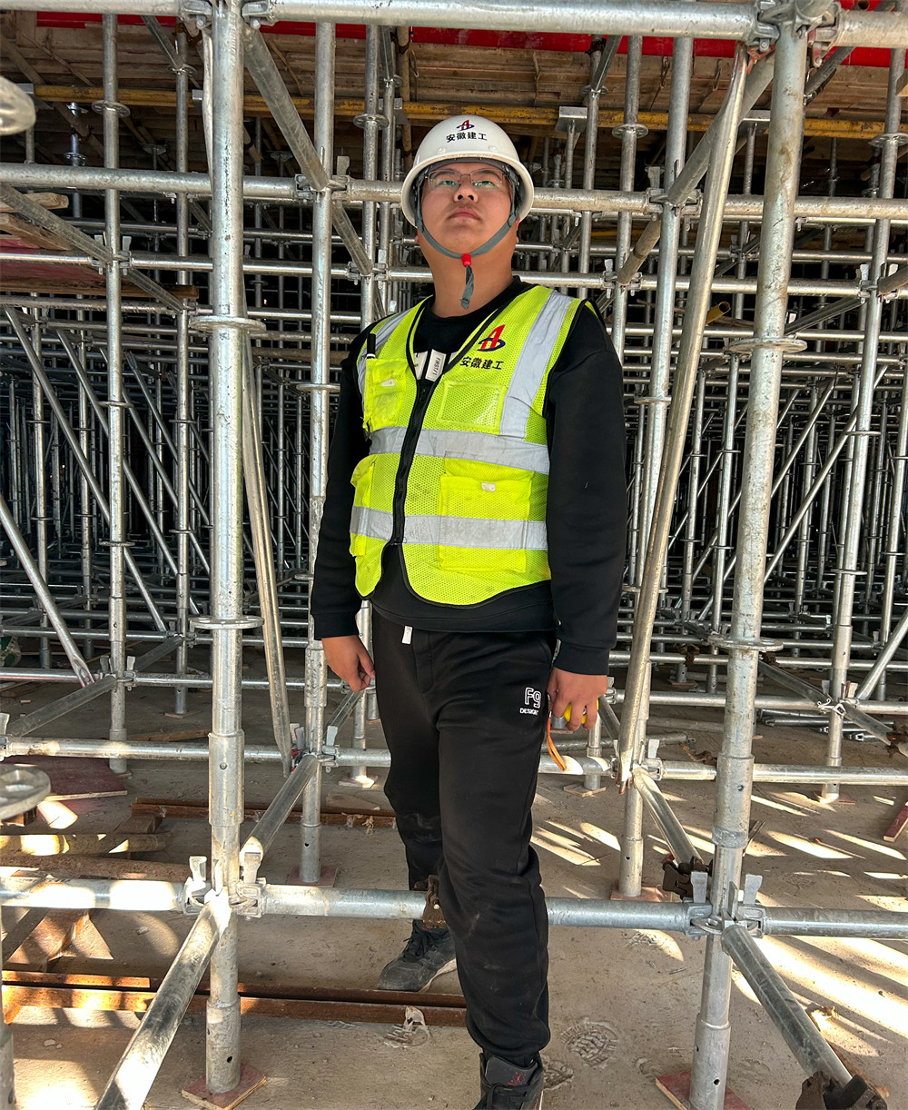 “新年新氣象,今后的工作中我會繼續(xù)勇往直前,全力保障項目生產(chǎn)。”技術(shù)員彭紹文正在檢查G6#樓南側(cè)地庫內(nèi)架搭設(shè)是否滿足要求。