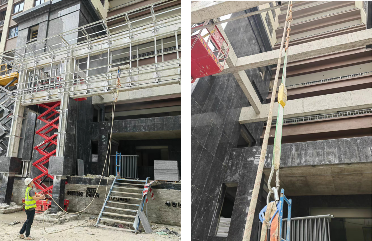 項目部在“安全生產(chǎn)月”期間加大巡查力度,對作業(yè)前的安全準備工作詳細策劃并指導實施。項目正值外墻裝飾階段施工,安全員在提醒作業(yè)人員系掛安全帶的基礎上,定期對采購的安全帶防墜落緩沖包進行試拉試驗,驗收合格后方可使用。同時對作業(yè)人員進行交底,包括安全帶的正確配置、系掛點的位置選擇、安全繩移動距離及有效長度等。