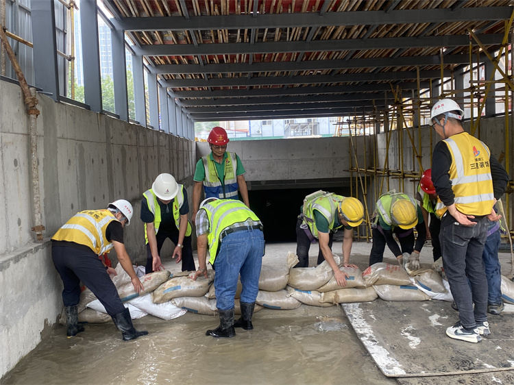 該演練模擬暴雨天氣,項目部內降水過大,可能會引發(fā)雨水灌入車庫,項目管理人員發(fā)現險情滯后,項目部立即組織管理人員,啟動防汛應急預案,各應急小組進入防汛抗洪搶險工作。防汛抗洪小組組織裝運沙袋至地庫入口進行封堵;同時疏散小組有序組織車庫作業(yè)人員進行疏散及撤離。