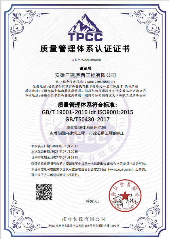 三建廬西公司取得質(zhì)量管理等體系認(rèn)證證書
