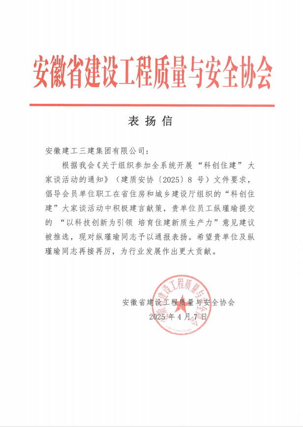 為響應(yīng)協(xié)會(huì)號(hào)召,安徽建工三建集團(tuán)積極建言獻(xiàn)策,公司職工黃波提交的《關(guān)于發(fā)展智能建造和推廣應(yīng)用建筑機(jī)器人的建議》和縱瑾瑜提交的《淺談“以科技創(chuàng)新為引領(lǐng) 培育住建新質(zhì)生產(chǎn)力”》因前瞻性與實(shí)踐價(jià)值突出,從眾多建言中脫穎而出,獲得協(xié)會(huì)高度認(rèn)可。信中特別強(qiáng)調(diào),兩項(xiàng)建議為行業(yè)智能化轉(zhuǎn)型和為傳統(tǒng)建筑行業(yè)注入科技新活力提供了新思路,體現(xiàn)了企業(yè)職工在科技創(chuàng)新中的責(zé)任擔(dān)當(dāng)。近年來(lái),公司通過(guò)搭建“產(chǎn)學(xué)研”平臺(tái),鼓勵(lì)員工立足一線探索技術(shù)突破。此次建議被采納,不僅展現(xiàn)了一線員工的智慧,更印證了集團(tuán)“科技強(qiáng)企”戰(zhàn)略的前瞻性。