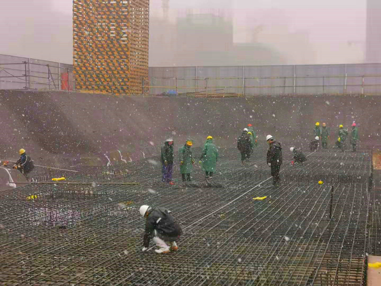 該項目于12月16日開工,甲方要求的1月20日前完成項目首開3棟樓地板結(jié)構(gòu)施工的任務(wù),工期十分緊迫。項目部自開工之初就牢牢樹立“不能按時交工為恥辱”的履約意識,面對嚴(yán)寒,項目部施工計劃、各項交底都充分考慮雨天天氣,同時提前做好冒雪工作準(zhǔn)備,安全防護(hù)、雨衣、膠鞋等防護(hù)工作皆已安排到位。由于提前準(zhǔn)備妥當(dāng),大雪紛飛時,項目施工現(xiàn)場絲毫未受影響,現(xiàn)場一派熱火朝天大干景象,放線的青年員工依舊一絲不茍的放線、自查筏板基礎(chǔ)鋼筋綁扎的依舊盯著鋼筋綁扎情況、加固項目生活板房的仍在一間一間盤查加固。。。 項目部表示,要進(jìn)一步做好冬季施工的安全、質(zhì)量、保障等工作,確保項目進(jìn)度和質(zhì)量。