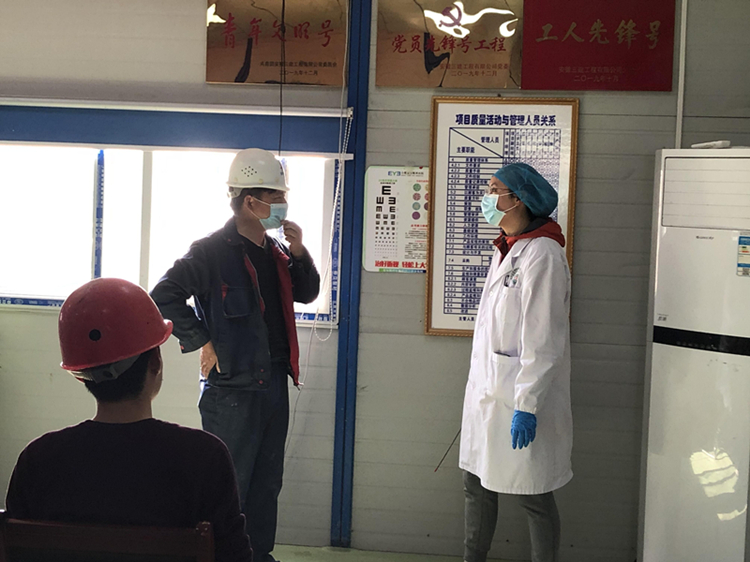 項(xiàng)目部根據(jù)各班組作息時(shí)間及施工特點(diǎn),有序地組織工人進(jìn)行健康檢查,做到施工、體檢“兩不誤” 。體檢項(xiàng)目包含常規(guī)身體檢查、測(cè)血壓及心電圖等10多個(gè)檢查項(xiàng)目。體檢期間,項(xiàng)目職工根據(jù)項(xiàng)目部安排的體檢時(shí)間提前到場(chǎng)排隊(duì)等候。特殊工種優(yōu)先,普通工種和后勤服務(wù)人員和管理人員全部覆蓋原則,醫(yī)務(wù)人員詳細(xì)地為每一名到場(chǎng)體檢的職工檢查身體情況及普及疫情防范基本知識(shí)。