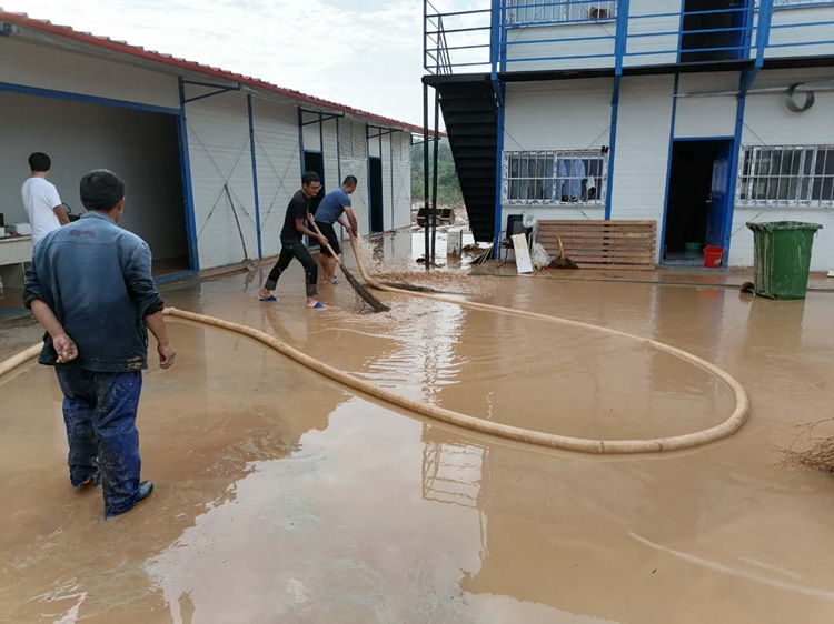 18日下午,四公司領(lǐng)導(dǎo)班子冒雨前往六安項目部,現(xiàn)場指導(dǎo)項目辦公區(qū)排水等抗洪自救工作。在當?shù)卣嘘P(guān)部門的協(xié)助下,項目部迅速開展排水自救,積水在2個小時后逐漸退去。19日下午,雨水完全退去,天氣逐漸轉(zhuǎn)好,項目全體管理人員奔赴現(xiàn)場清理辦公區(qū),雖然已經(jīng)疲憊不堪,但大家依然認真清掃項目部,當天便恢復(fù)項目辦公環(huán)境,為下一步恢復(fù)生產(chǎn)奠定了基礎(chǔ)。