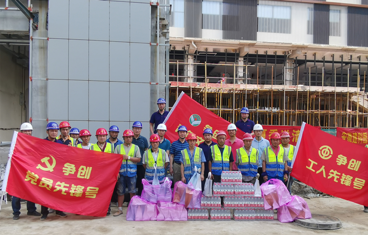 8月18日下午,安徽省建筑科學(xué)研究設(shè)計(jì)院副院長(zhǎng)李躍進(jìn)帶隊(duì)深入科研樓改造項(xiàng)目工地,慰問(wèn)奮戰(zhàn)在施工一線的管理人員和工人,送來(lái)綠豆、白糖、毛巾、十滴水、仁丹、風(fēng)油精、礦泉水等防暑降溫物品,為戰(zhàn)高溫、奪高產(chǎn)的一線人員加油鼓勁。李躍進(jìn)在現(xiàn)場(chǎng)強(qiáng)調(diào)要把安全放在第一位,落實(shí)夏季高溫防暑措施,避開(kāi)高溫時(shí)段施工作業(yè),防止人員中暑。