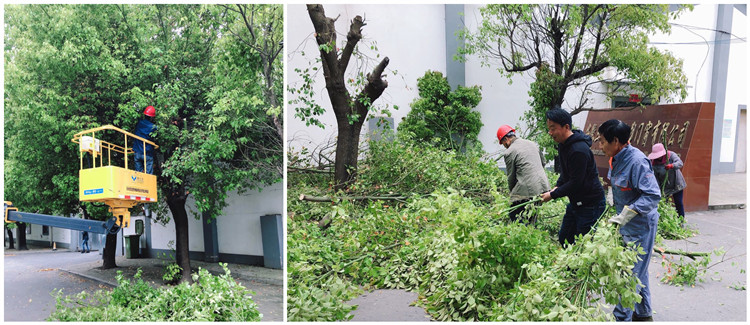 在修剪的過程中,由于樹木參差不齊,有的已經(jīng)觸碰到電線,非常危險,處理起來比較困難,設(shè)備租賃公司黨支部為了解決這一難題,采取應(yīng)對措施----租借升降車,工作人員利用專業(yè)油鋸在保證自身安全的情況下,對樹木進行修剪,遇到較高、粗壯的樹枝也是一遍又一遍耐心的鋸割,大伙兒有的鋸樹枝、有的搬木頭、有的清掃垃圾……分工合作,相互配合,干的熱火朝天、忙的不亦樂乎,一個個汗流浹背。最后將修剪下來的大樹枝被及時清運,保證新基地行人車輛的安全通行。經(jīng)過一天緊張有序的工作,整個新基地的環(huán)境煥然一新。