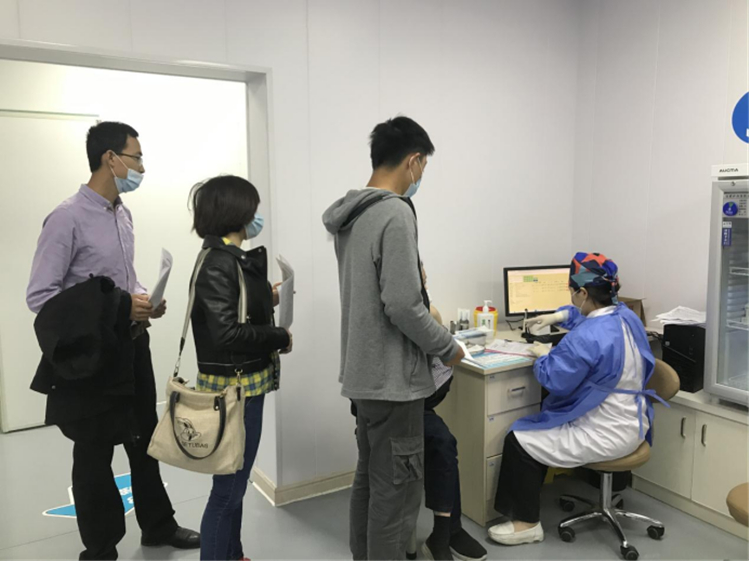接種人員到達(dá)醫(yī)院后填寫《新冠疫苗接種知情同意書》,并掃描醫(yī)院專屬二維碼登記建檔,經(jīng)簡易體檢查看是否符合接種要求,確認(rèn)沒問題后再進(jìn)行疫苗接種。在接種完成后留觀區(qū)觀察30分鐘,無異常反應(yīng)后再由專車送回項(xiàng)目。