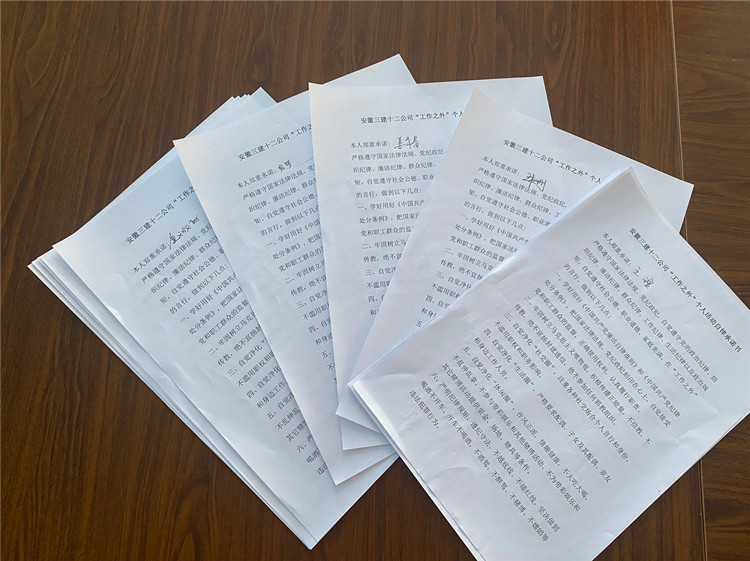 隨后,十二公司滁州時代名邸、蒙城高速、滁州高速等各項目部紛紛組織員工簽訂“工作之外”個人活動自律承諾書,進(jìn)一步保證項目部和諧穩(wěn)定的工作生活環(huán)境,自覺抵制各種不良的行為習(xí)慣。