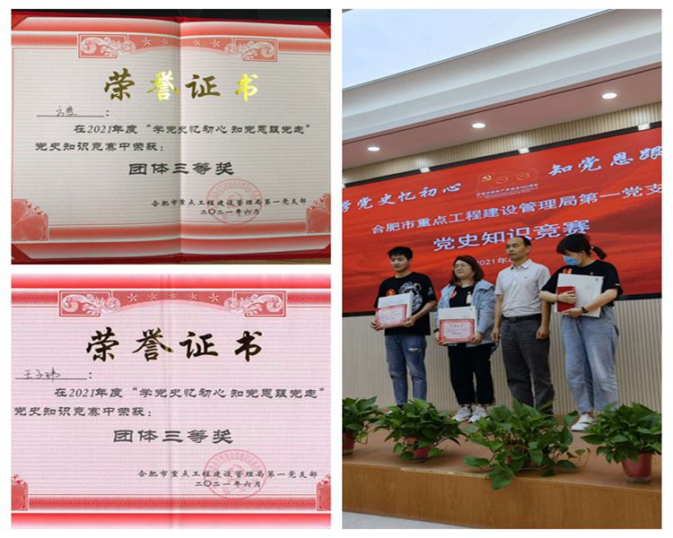 6月18日上午,合肥市重點工程建設管理局第一黨支部主題黨史知識競賽在中建二局濱湖會展中心二期項目部隆重拉開帷幕,安徽三建合肥一中校園品質提升及藝術禮堂建設項目代表隊喜獲此次黨史知識競賽團體三等獎。