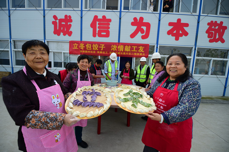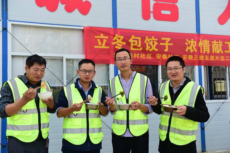 安徽三建五里片區(qū)項(xiàng)目臨時(shí)黨支部與汲橋社區(qū)志愿者聯(lián)合開“立冬包餃子 濃情獻(xiàn)工友”活動(dòng)