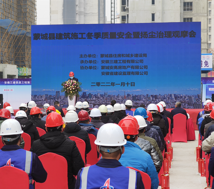 為切實(shí)做好蒙城縣建筑工程冬季施工質(zhì)量安全及揚(yáng)塵治理管理工作,加強(qiáng)施工現(xiàn)場(chǎng)管理經(jīng)驗(yàn)的學(xué)習(xí)與交流,提高從業(yè)人員質(zhì)量安全生產(chǎn)意識(shí),推進(jìn)質(zhì)量安全生產(chǎn)標(biāo)準(zhǔn)化工作落實(shí)到位,1月10日上午,蒙城縣建筑施工冬季質(zhì)量安全暨揚(yáng)塵治理觀摩會(huì)在安徽三建承建的蒙城高速時(shí)代首府項(xiàng)目順利召開(kāi)。 蒙城縣副縣長(zhǎng)劉鵬,縣住建局、應(yīng)急管理局、人社局等相關(guān)部門(mén)負(fù)責(zé)人以及全縣所有在建項(xiàng)目業(yè)主代表、項(xiàng)目經(jīng)理、總監(jiān)約200人參會(huì)。