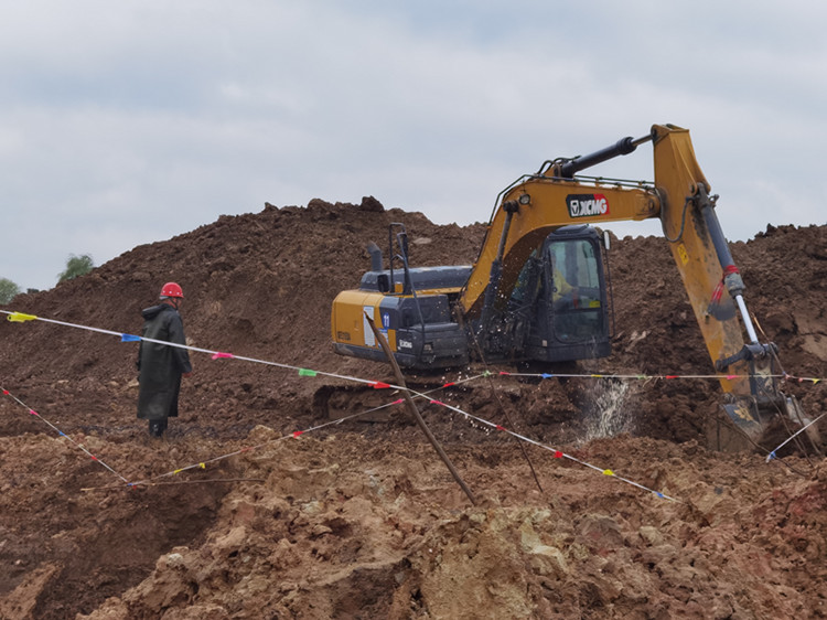 防汛現(xiàn)場,挖掘機(jī)在指揮下同時開挖溝槽,將河塘積水自董崗健康驛站北側(cè),順梅城路到將軍嶺路,由北向南成90度繞開障礙物,引入肖小河左支流下游,共計溝槽開挖近400米。
