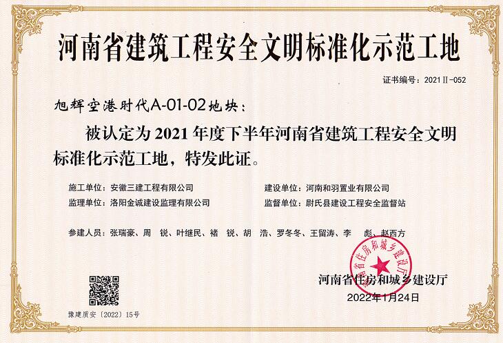 旭輝空港時(shí)代項(xiàng)目獲評(píng)河南省“建筑工程安全文明標(biāo)準(zhǔn)化示范工地”稱號(hào)