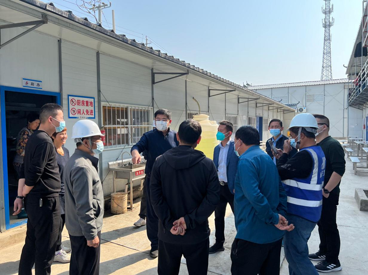 4月20日上午八點(diǎn)半蕪湖市鳩江區(qū)區(qū)委常委、常務(wù)副區(qū)長(zhǎng)戴鳴帶隊(duì)一行人至安徽省公共衛(wèi)生臨床中心(蕪湖)項(xiàng)目進(jìn)行疫情防控專項(xiàng)檢查,詳細(xì)了解項(xiàng)目規(guī)模、封閉管控人數(shù)、核酸檢測(cè)采樣情況等基本信息,認(rèn)真查看項(xiàng)目大門及生活區(qū)封閉情況,要求加強(qiáng)巡查檢查,強(qiáng)化宣傳引導(dǎo),確保人員自覺不外出、不串門、不扎堆,共同筑牢疫情防控安全防線。走進(jìn)生活區(qū)慰問封閉管理的項(xiàng)目一線工人,仔細(xì)詢問民工食堂物資儲(chǔ)備情況。戴區(qū)長(zhǎng)提出要高度重視物資保障工作,想盡一切辦法做好項(xiàng)目人員米、面、蔬菜等生活必需品供應(yīng),并將屬地村支部張書記介紹給項(xiàng)目,要求如有困難及時(shí)對(duì)接屬地,保障項(xiàng)目人員生活物資的正常供應(yīng)。