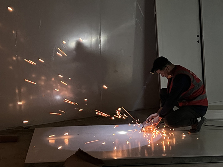 夜幕降臨,合肥春天的夜晚仍?shī)A雜著絲絲涼意,肥西縣疫情隔離點(diǎn)備用區(qū)(三期)工程,塔吊在大功率的光源下仍進(jìn)行著吊裝作業(yè),在吊臂下落的打包箱配件的不遠(yuǎn)處,二公司安全員任杉杉戴著安全帽,向著吊車司機(jī)喊道“慢、慢、慢”,在打包箱房頂配件緩緩落在箱房的支撐點(diǎn)之時(shí),數(shù)名操作工立即手持電動(dòng)機(jī)械找準(zhǔn)各個(gè)支撐點(diǎn)位,用最快速度完成安裝工作。