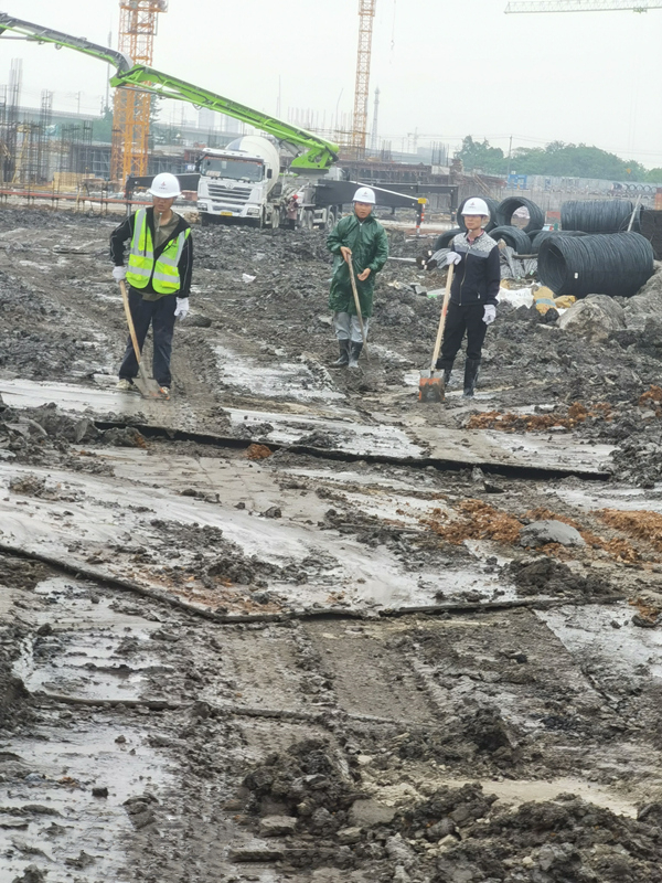 上午十點,汽車泵架設(shè)到位開始澆筑砼,根據(jù)天氣預(yù)報,次日夜里四點雨水來臨前能夠完成砼澆筑任務(wù),但下午三點起一場突如其來的中雨,將施工鋼板道路變得泥濘,造成砼罐車打滑,無法通行?,F(xiàn)場管理人員迅速反應(yīng),自發(fā)地互相召集拿起鐵鍬開始清理起施工鋼板道路上的淤泥,從開始的三人、五人,再到八人、十四人。終于,在大家的共同努力下,原本泥濘的鋼板路再次變成通途,確保了砼澆筑作業(yè)的正常進行。安徽省公共衛(wèi)生臨床中心(蕪湖)項目部積極發(fā)揮企業(yè)作風(fēng),攻堅克難。正如近期企業(yè)70年慶宣傳的口號——“七秩春秋展芳華,同心筑夢續(xù)新篇”,項目部全體管理人員將一如既往地做好本職工作為企業(yè)高質(zhì)量發(fā)展添磚加瓦。