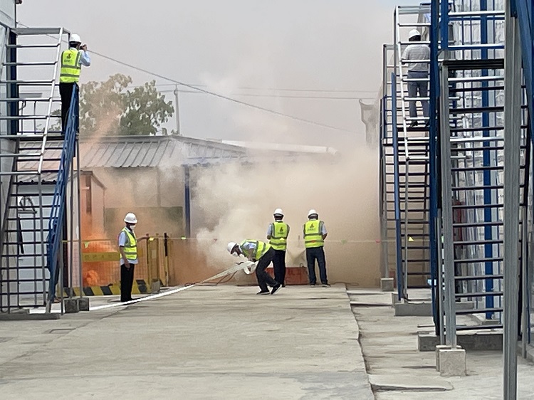 啟動儀式后,項目開展了模擬違規(guī)使用大功率電器導(dǎo)致失火的消防演練與違章作業(yè)未佩戴安全帶導(dǎo)致的高墜救援演練,演練參加人員進(jìn)行了作業(yè)前的安全準(zhǔn)備事項,現(xiàn)場人員的疏散,滅火器、消防栓的使用,應(yīng)急處理措施、緊急綁扎以及應(yīng)急救援上報等流程的演練。