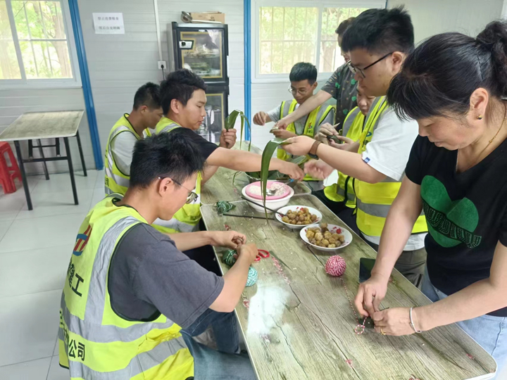 活動(dòng)現(xiàn)場洋溢著濃厚的節(jié)日氛圍,大家圍坐在一起,折粽葉、填糯米、加蜜棗、系棉線,邊包粽子邊交流技巧,忙得不亦樂乎。經(jīng)過一個(gè)多小時(shí)的努力,一個(gè)個(gè)形狀各異的粽子展現(xiàn)在大家面前,看著自己辛勤的成果,大家心里樂開了花。紛紛感嘆:“雖然不在家里過端午,但能在項(xiàng)目部這個(gè)大家庭和同事一起包粽子很熱鬧,真切地感受到了家一樣的溫暖”。