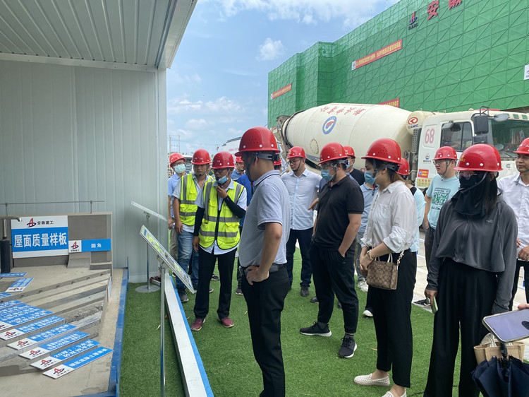 上午10點(diǎn)觀摩團(tuán)一行首先來到了五公司承建的產(chǎn)城融合示范區(qū)文化中心項(xiàng)目的檔案館施工現(xiàn)場,文化中心項(xiàng)目經(jīng)理張禮君帶領(lǐng)觀摩團(tuán)先后參觀了安全、質(zhì)量、機(jī)電安裝等樣板展示區(qū),現(xiàn)場兩位講解員更是從安全管理、質(zhì)量管理、進(jìn)度管理、技術(shù)創(chuàng)新、揚(yáng)塵防治、黨建活動(dòng)開展、疫情防控等幾個(gè)方面作了具體介紹,并且重點(diǎn)介紹了高強(qiáng)鋼筋直螺紋連接技術(shù)、預(yù)應(yīng)力技術(shù)、銷鍵型腳手架及支撐架、基于BIM的管線綜合技術(shù)、綠色施工在線監(jiān)測評價(jià)技術(shù)、施工揚(yáng)塵控制技術(shù)等新技術(shù)在項(xiàng)目中的應(yīng)用,得到了觀摩團(tuán)的一致認(rèn)可。