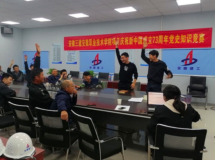 10月1日,滁州天長恒大項目部組織了“升國旗唱國歌”活動;國慶當(dāng)晚,江淮學(xué)院項目部組織了“歌唱祖國,慶祝中華人民共和國成立73周年卡拉OK比賽”,分公司領(lǐng)導(dǎo)班子不僅深入一線與職工們一起引吭高歌,還特地邀請部分職工家屬來請到項目上,讓聚少離多的他們能夠和家人一起歡度佳節(jié);10月5日,安徽職業(yè)技術(shù)學(xué)院實訓(xùn)中心項目部開展了“慶祝新中國成立73周年黨史競賽”活動。