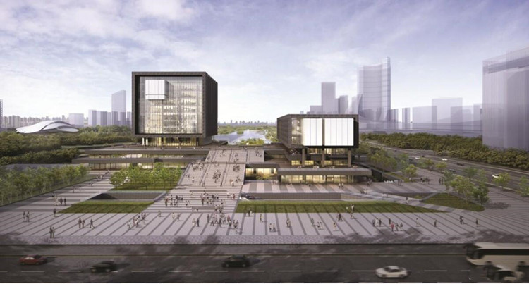 據(jù)悉,該項(xiàng)目位于政務(wù)區(qū)翡翠路與祁門路交口東北角,包括:圖書館主體建筑(含城市展示館、超級(jí)書庫等)以及廣場、道路、景觀、車庫等相關(guān)附屬設(shè)施。其中北側(cè)的中心圖書館地上11層,建筑高度63米,南側(cè)為文化展示中心地上5層,建筑高度33米。
