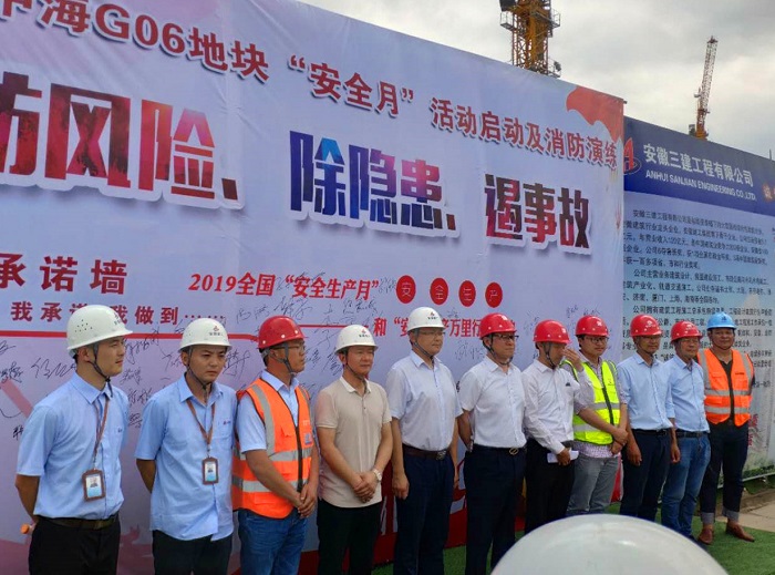 繼第一批公司8個(gè)單位舉行“安全月”啟動(dòng)儀式后,近期,設(shè)備租賃公司、輕鋼龍骨公司、裝飾公司、上海公司等也積極啟動(dòng)“安全月”活動(dòng),將“安全月”活動(dòng)推向深入。6月6日上午,七公司2019年“安全生產(chǎn)月”活動(dòng)啟動(dòng)儀式在南京中海項(xiàng)目舉行,儀式上進(jìn)行了安全宣誓并現(xiàn)場(chǎng)開展消防演練。中海地產(chǎn)副總經(jīng)理鮑壯志、項(xiàng)目總監(jiān)高偉受邀出席了儀式。公司副總經(jīng)理李建成參加了活動(dòng)并講話。