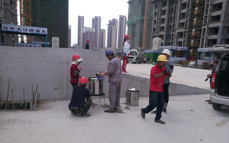 三伏天到撲面而來的熱氣令人眩暈,持續(xù)的高溫天氣中,為了項目進(jìn)度質(zhì)量,防水公司依舊奮戰(zhàn)在施工現(xiàn)場第一線,底板、外墻、室內(nèi)施工處隨處可見一線工人的身影,大家揮汗如雨,越是高溫防水、保溫工作也越要高效率高質(zhì)量的完成。粘貼卷材、涂刷涂料、粘貼板材等工序都按照施工工藝不折不扣的被完成。圖為,分公司為保障項目人員健康發(fā)放防暑降溫物品