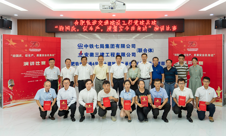 9月10日下午,合肥市軌道建設(shè)工程黨建共建“迎國慶、促生產(chǎn),質(zhì)量安全在身邊”征文演講比賽在公司軌道交通項目部會議室精彩開賽。本次黨建共建活動由合肥市城鄉(xiāng)建設(shè)局軌道質(zhì)量安全監(jiān)督站黨支部,中鐵七局、安徽三建合肥軌道4號線4標(biāo)聯(lián)合黨支部,中鐵四局合肥軌道5號線4標(biāo)黨支部,中鐵電化局合肥軌道3號線供電1標(biāo)黨支部聯(lián)合開展。合肥軌道監(jiān)督站站長陳萬立、副站長汪勁松,中鐵七局武漢公司黨委書記吳越、副總經(jīng)理馮明輝,中鐵電氣化局西安公司黨委副書記楊永乾、中鐵四局四公司組織部部長范君賢,公司黨委副書記黃麗春、副總經(jīng)理王興明參加活動?;顒舆€邀請了新華社、中國網(wǎng)等新聞媒體專家做評委。