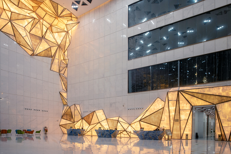 大堂是五星酒店裝飾的焦點,也是銅川悅豪工程最困難的地方。為了呈現(xiàn)獨特的光照效果,大堂大面積采用不規(guī)則、多層次轉(zhuǎn)角透光云石裝飾。云石單塊最大重量超過200公斤,安裝精度要達到2毫米,才能確保裝飾效果,而這些都要在24米的空中進行安裝,困難重重,業(yè)主方也心里沒有底。