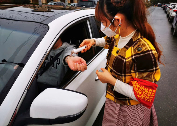 陽海英在小區(qū)為往來人員測(cè)量體溫