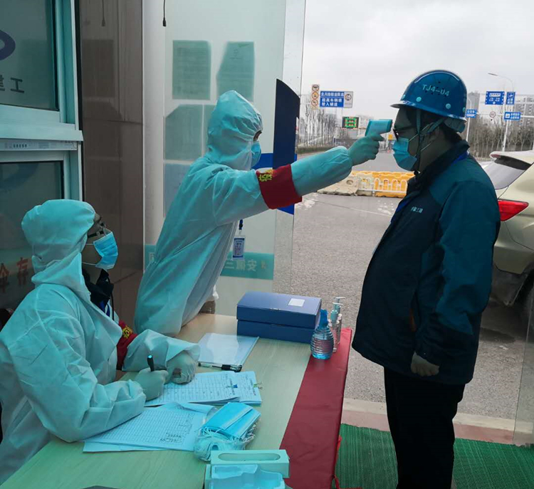 建筑工業(yè)公司志愿者為所有入場人員測溫、消殺、登記