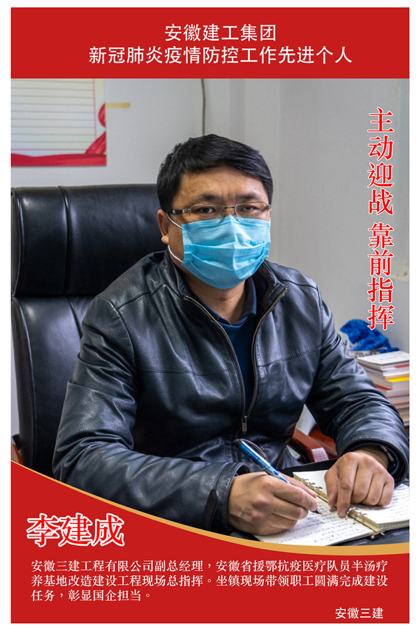 李建成,安徽三建工程有限公司副總經(jīng)理,安徽省援鄂抗疫醫(yī)療隊員半湯療養(yǎng)基地改造建設(shè)工程現(xiàn)場總指揮。在攻堅抗疫應(yīng)急工程的戰(zhàn)斗中,他勇?lián)?zé)任,靠前指揮,連續(xù)14天坐鎮(zhèn)現(xiàn)場指揮調(diào)度,迅速解決現(xiàn)場遇到的材料供應(yīng)和勞務(wù)人員組織、出行、防疫物資供給等困難,為按期圓滿完成省援鄂抗疫醫(yī)療隊員半湯療養(yǎng)基地改造工程起到了關(guān)鍵性的作用,彰顯了國企領(lǐng)導(dǎo)的使命擔(dān)當(dāng)。