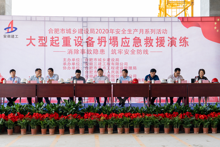 本次應急救援演練活動由合肥市城鄉(xiāng)建設局主辦、安徽三建工程有限公司承辦。合肥市城鄉(xiāng)建設局質量安全處副處長胡景琦、合肥市建筑質量安全監(jiān)督站副站長孫巍、合肥市重點工程建設管理局公益分局項目辦主任周松、合肥市二院副院長魏敦英、安徽建工集團工管部(安全監(jiān)察局)副局長葛輝、安徽南巽建設項目管理投資公司董事長李培貴以及安徽三建黨委副書記、總經理何洪春、副總經理李建成等出席活動。安徽三建所屬各單位分管領導、安全科長、合肥地區(qū)項目經理及項目安全負責人等100余人現(xiàn)場參加活動,行業(yè)內部5千余人網絡在線觀看活動直播。