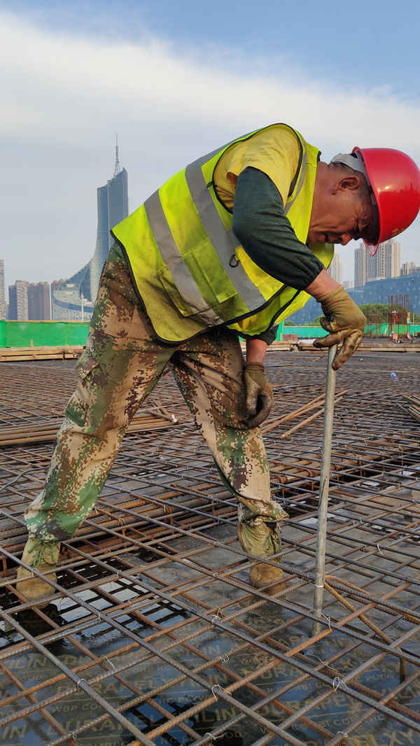 頂板澆筑的時候,質(zhì)量員吳培從夜里12點一直干到第二天中午12點澆筑完畢。問起當天的情況,吳培說“這次澆筑區(qū)域含型鋼混凝土結(jié)構(gòu),核心筒部位施工難度較大,在現(xiàn)場看著,心里才踏實?!睘榱舜_保工程質(zhì)量,吳培常常拿著塔尺在炎炎烈日下進行控制標高,黑里透紅的臉色是戰(zhàn)高溫標志色。